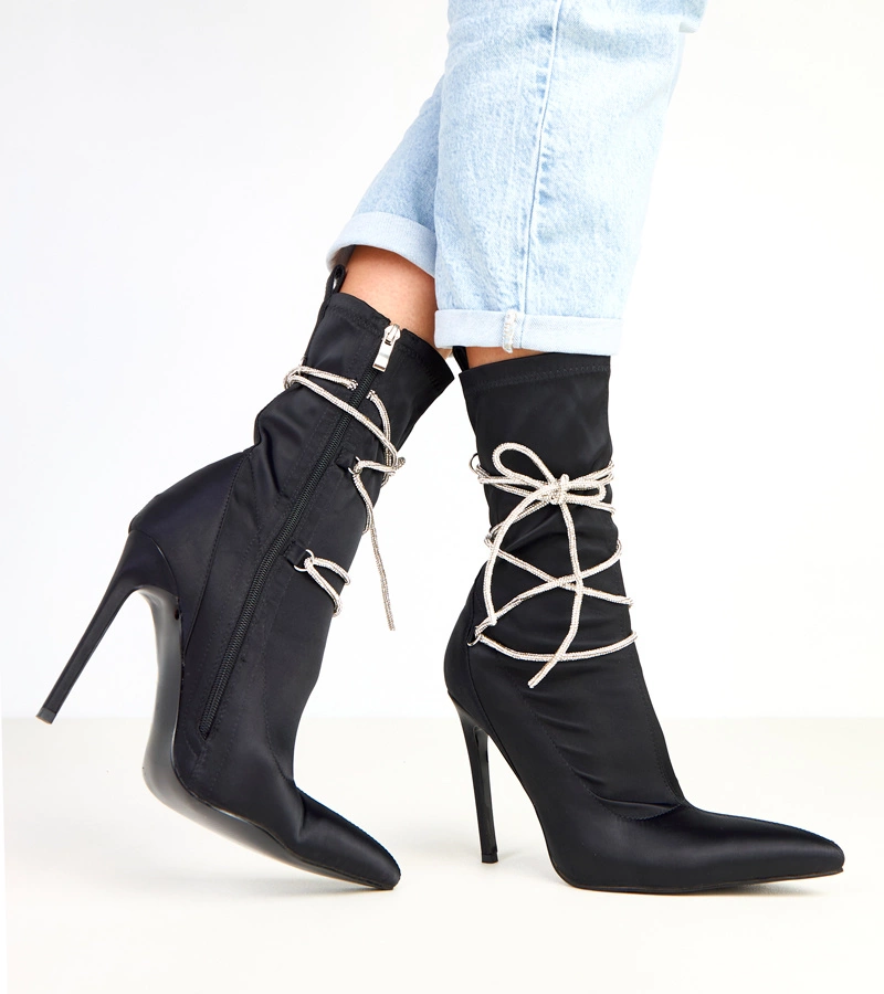 Čierne saténové členkové topánky na ihličkovom podpätku zdobené kamienkami Tolnai