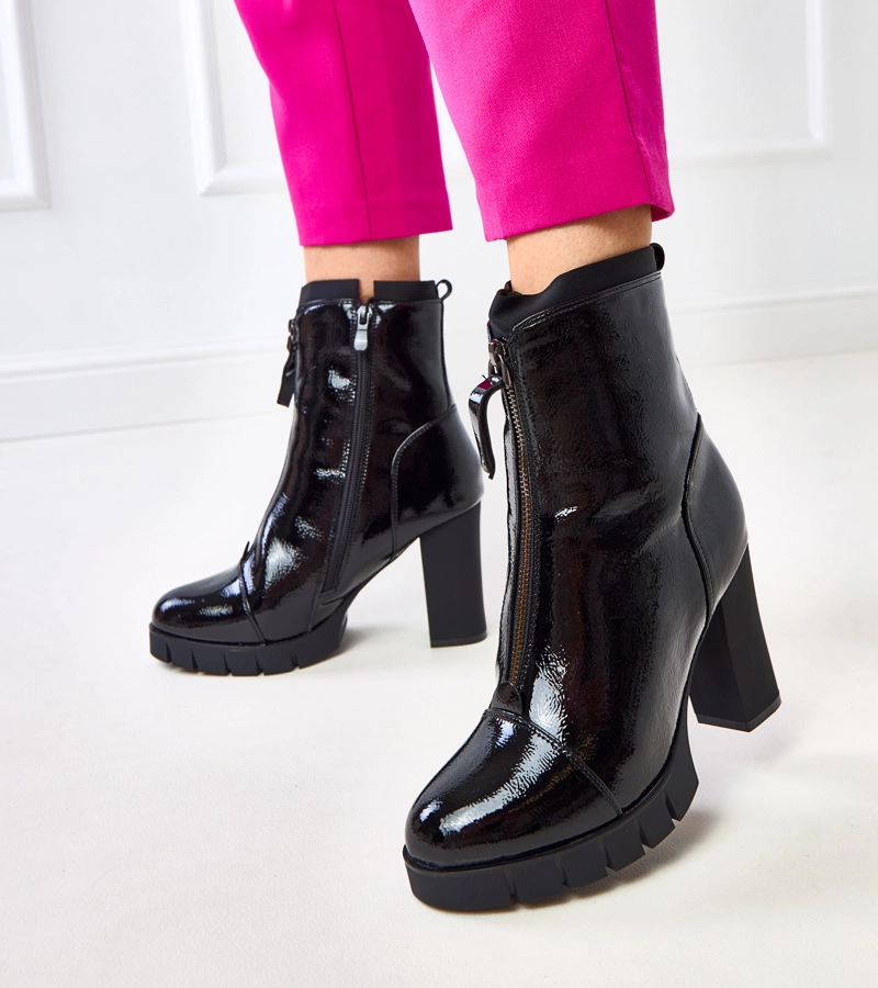 Čierne lakované lodičky na podpätku s remienkom Saga