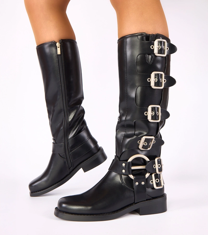 Čierne čižmy na plochom opätku zdobené prackami Taliba