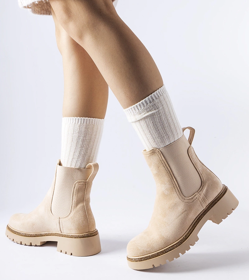 Béžové eko-semišové nízke čižmy na podpätku od spoločnosti Sovere