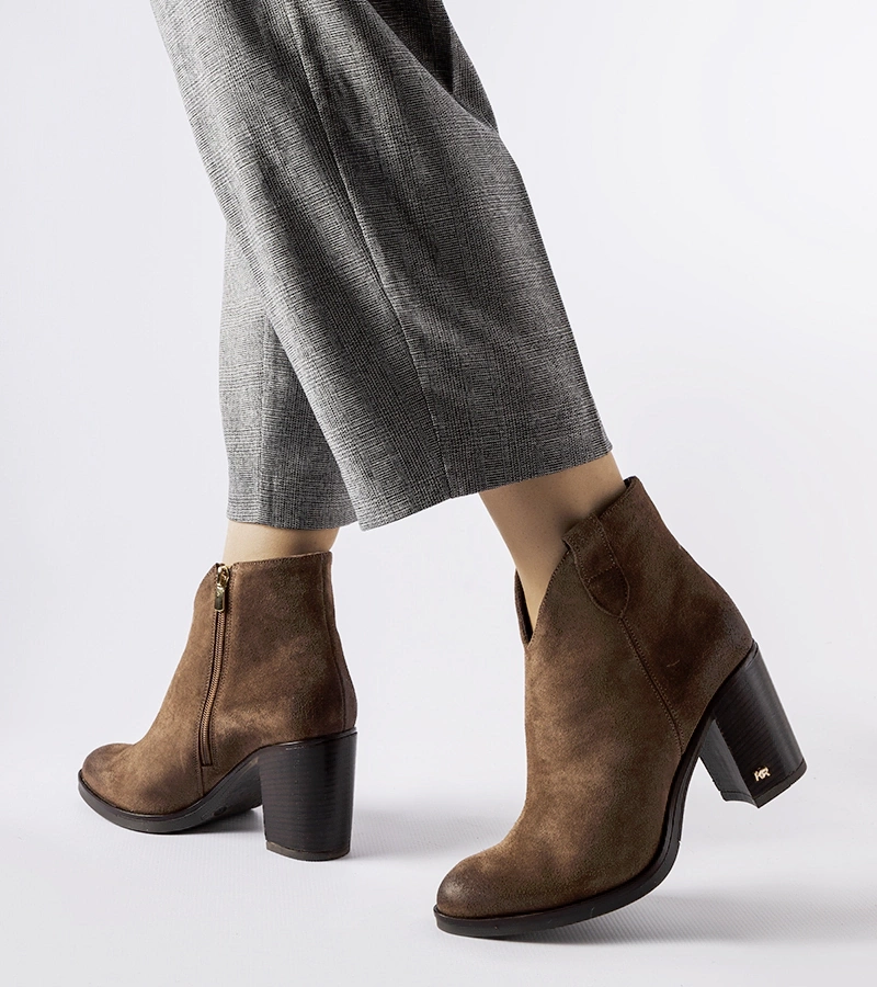 Hnedé členkové topánky na vysokom masívnom podpätku z eko-zamszu Dunyana.