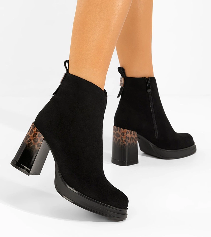 Čierne členkové čižmy na podpätku zdobenom leopardím vzorom Delora