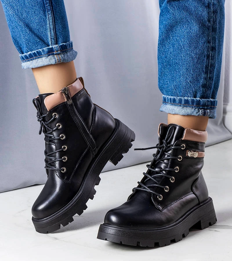 Čierne lakované zateplené traperské topánky od spoločnosti Dielle