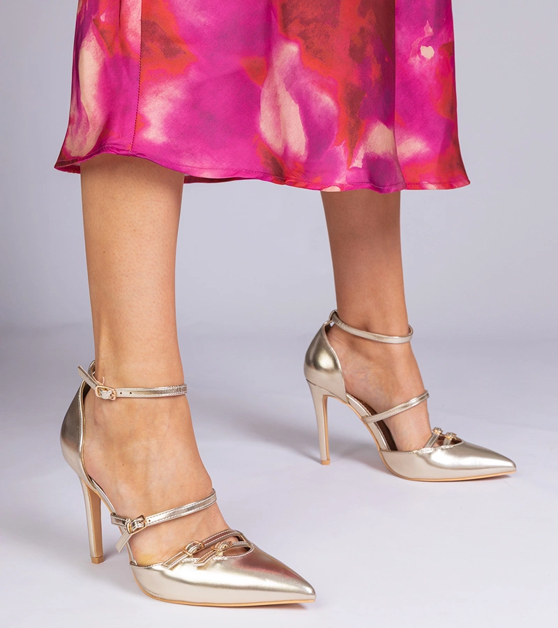 Zlaté lodičky na ihlovom podpätku zapínané okolo členku Levita
