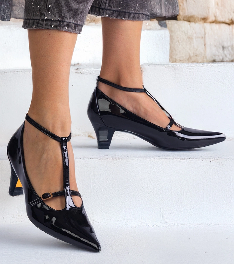 Lakované čierne lodičky na nízkom opätku s prackami Imisa