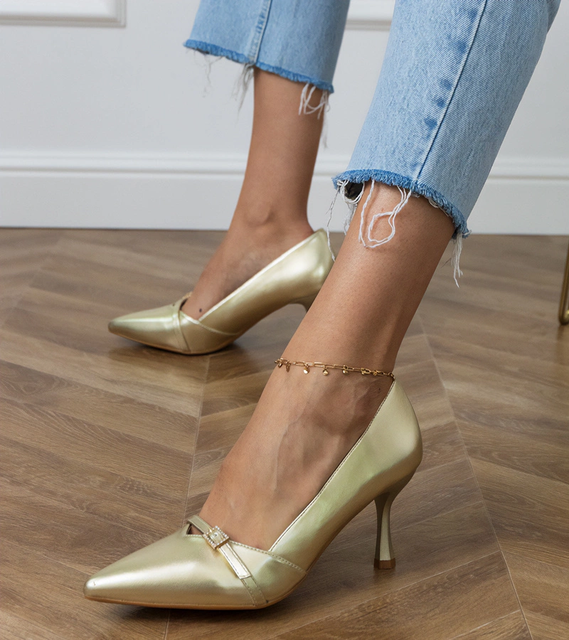 Zlaté lodičky na podpätku zapínané na členku Keris