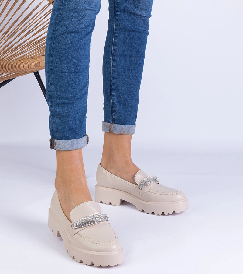 Béžové dámske mokasíny so zlatou ozdobou a kryštálikmi Mikasa