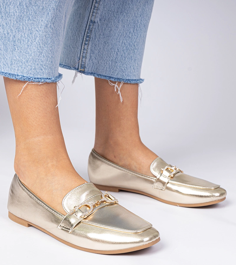 Zlaté elegantné mokasíny so zlatou ozdobou a zirkónmi Kalisa