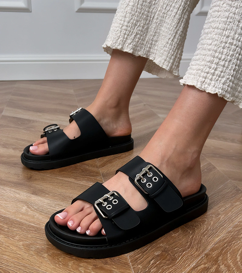 Čierne ploché šľapky s cvokmi na remienku Luvva