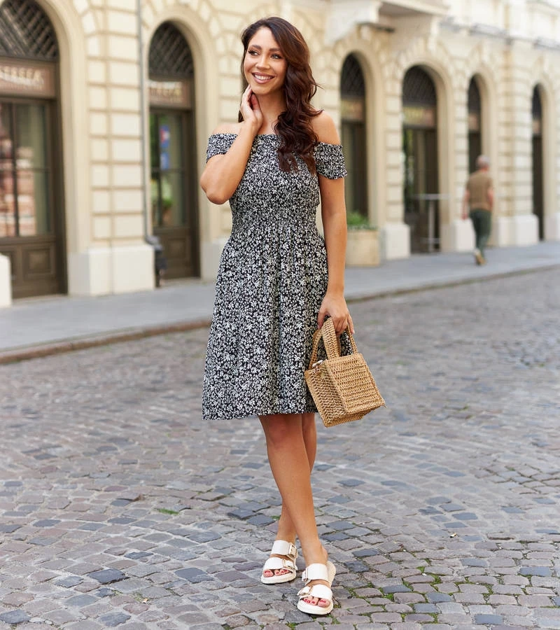 Šedé šaty na ramienkach s kvetinovým vzorom Attilio